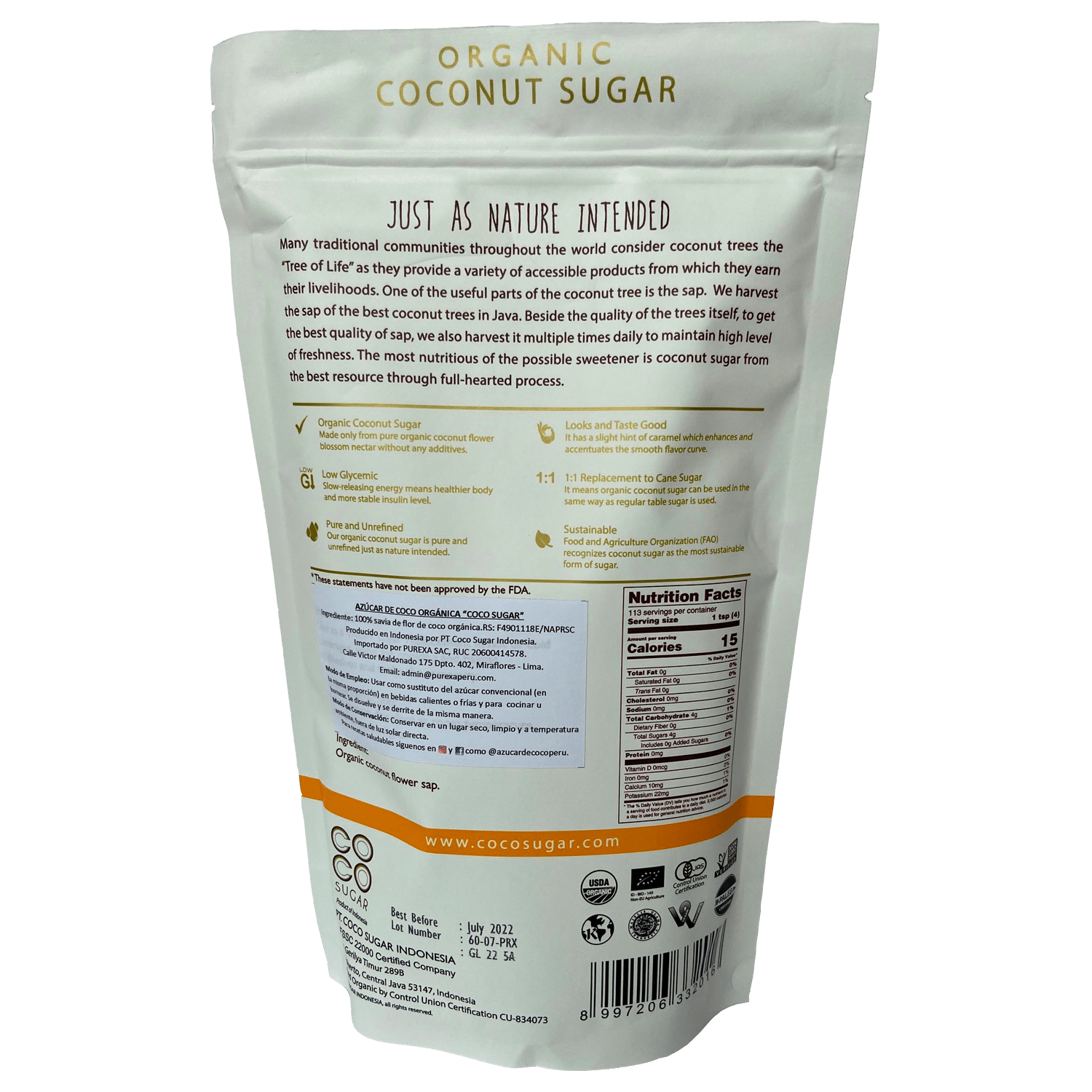 Nuestra azúcar de coco orgánica Coco Sugar, proviene de Indonesia y es un endulzante sano y natural, derivado de extraer la savia de las flores de la palma cocotera que, tras evaporar su humedad al fuego, va cambiando de color hasta convertirse en una sustancia densa, este procedimiento consigue que se retengan parte de los nutrientes de la flor y se obtiene un endulzante que puede tener una textura cristalina similar a la del azúcar rubia, con un ligero color marrón y aroma tostado que se cristaliza en azúcar de coco. Se compone de 80% agua, 15% azúcar y 5% minerales.